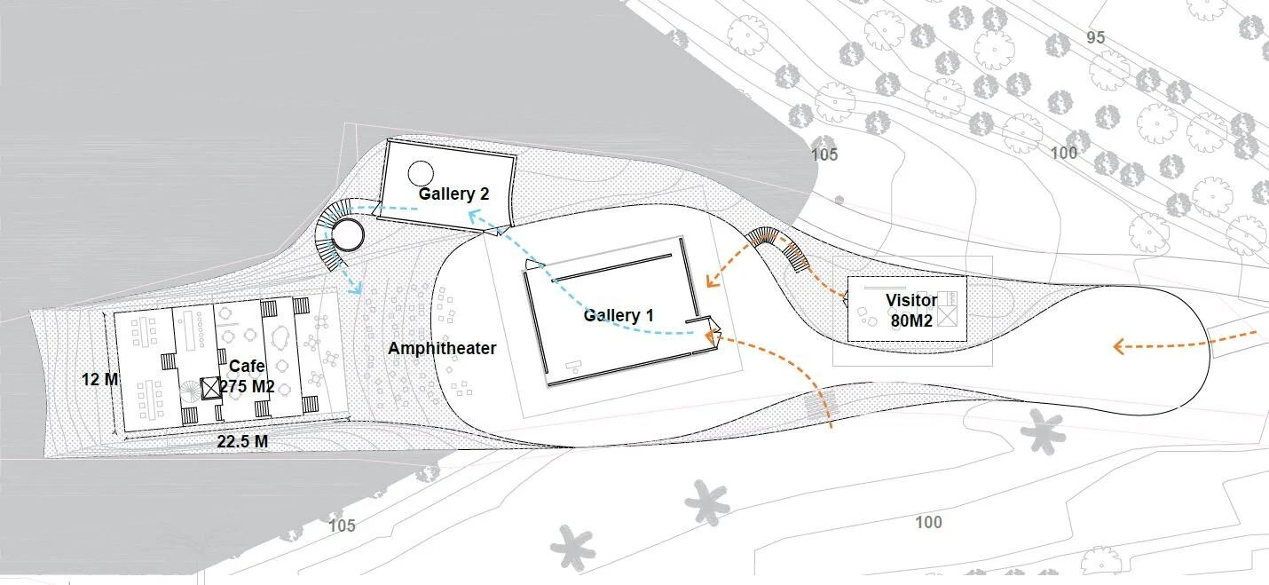 The first design aimed at framing art in nature through the creation of a connected portfolio of rooms, where the combination of straight and curved lines creates a unique array of spaces, in an alternating indoor outdoor setting, as the spaces respond to the steep topography and move along with it. Another element driving the design is the datum of 4.5 meters, a continuous profile that contains the program, while allowing the topography and roofs to undulate above and below the datum.