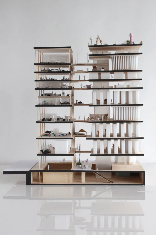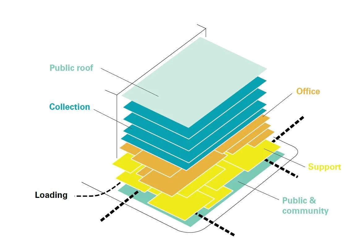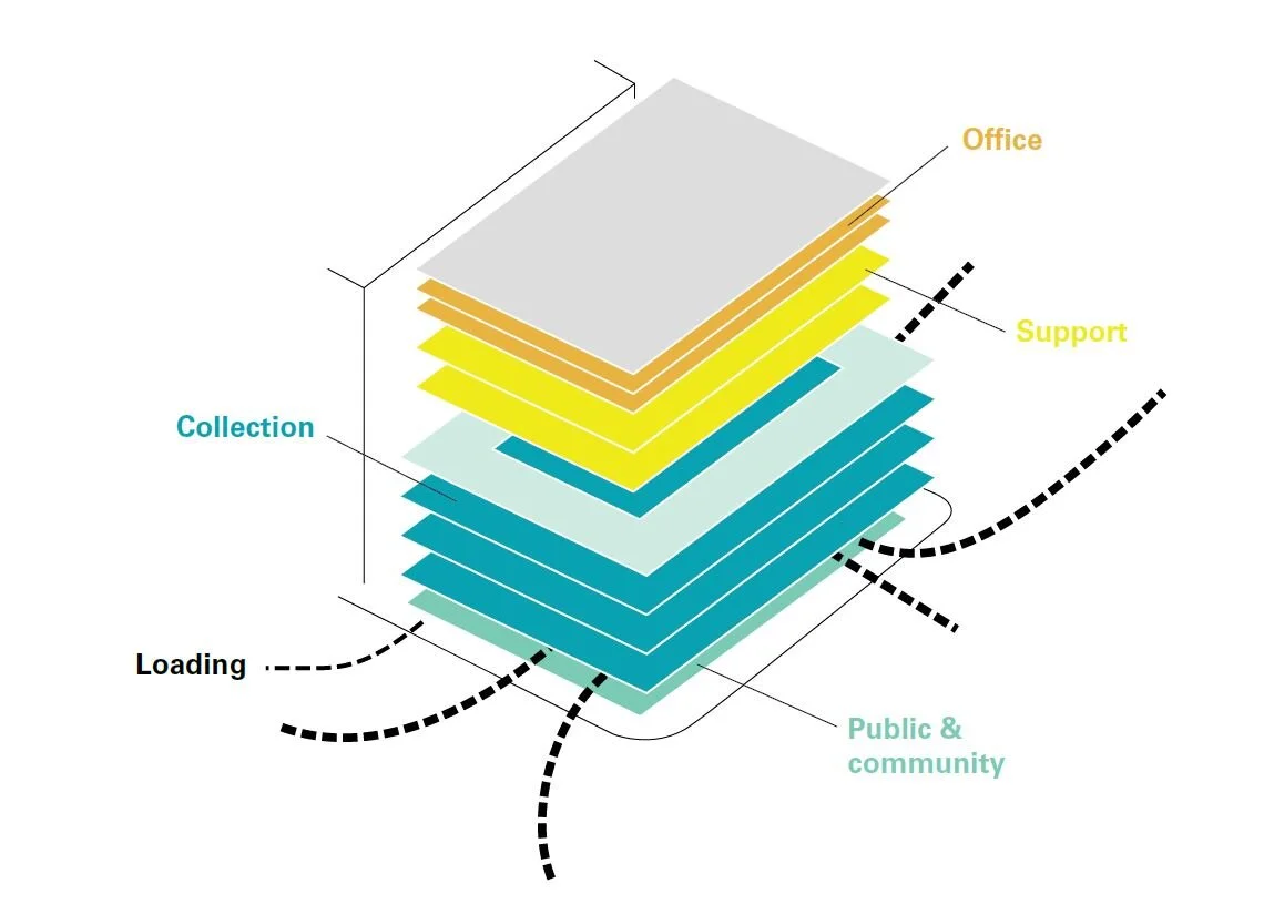 An open structure of terraces and columns emerges from the ground and blends a more closed storage volume at the top of the building with more porous floors below. A shifting landscape of terraces contains the office and collection support spaces. The grain of the structure becomes smaller towards the ground to connect to the scale of the neighborhood and residential spaces and provides space for the community as well as for retail. Moving the storage to the top of the building allows staff and collection support to create a more casual relationship to eachother and to the ground.The activity of the building becomes visible to the ground floor community program spaces. A large public roof, mirroring the full area of the lot, tops the storage volume. This can be a new elevated park for the neighborhood or the SRGF community, suitable for a range of events at various scales.