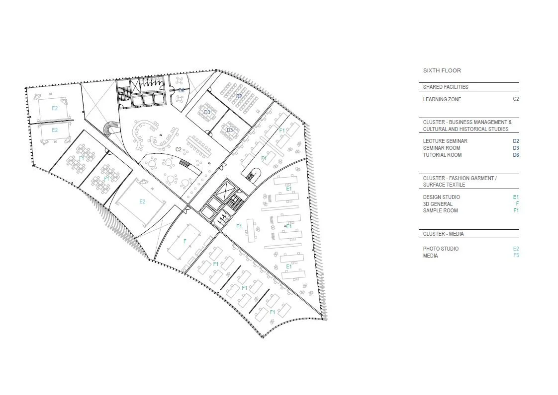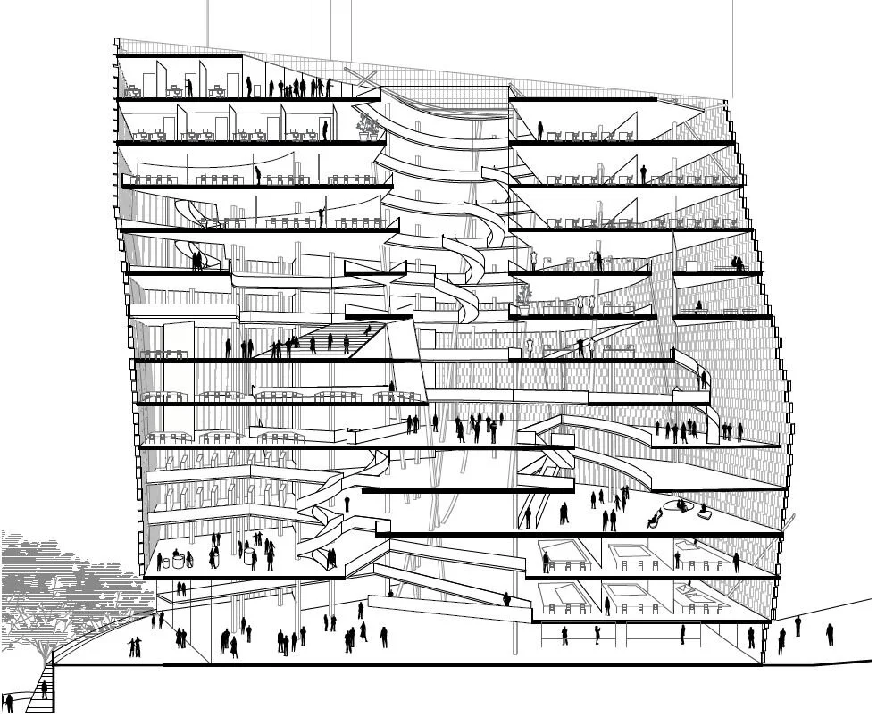 The design proposal organizes the academic program in subject clusters instead of traditional departments. The clusters are organized and interconnected around a network of vertical shared spaces - social connectors - that function symbolically and literally as the collective spaces of a campus.