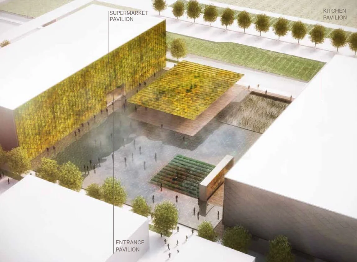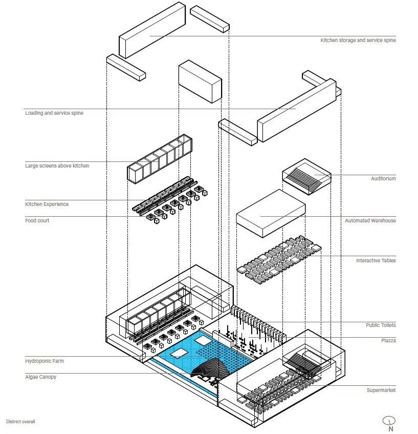 The Internet of Things allows us to rethink the current linear food supply chain, and move towards a closed loop connecting people to the food network. The concept of the Internet of Food and People is based on the possibility that the objects (specifically the products of Supermarket) provide information about themselves, including, for example, traceability and consequently new possibilities of interaction with the products within the chain of production and distribution of products. The site can be separated into a number of distinct areas and elements. The main distinct areas are: • The Supermarket Pavilion • The Garden • The Table • The Kitchen Pavilion The distinct design elements that connect and enclose these areas are: • The Canopy (Algae and Bugs) • The Facades • The Urban Farm The cohesive design of these areas and elements, and their connection to the surrounding context, represent the design of the Future Food District.