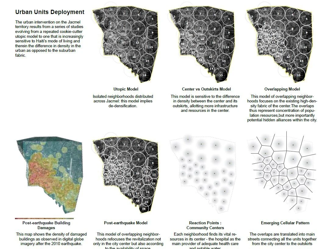 [3] The City Scale: Reclaiming Crisis, Provoking Controlled Urban Responses The last set of work of this architectural trilogy further explores the idea that medical, social and urban crisis can be used as a vector for the production of new realities for Jacmel. Scope of intervention The scope of the project recognizes the need for a large scale intervention. This is not about one hospital, but about the alliances of a manifold of interconnected hospitals within the city. Deployed as such, the hospitals become more than health care providers, but also reinforcement to the city infrastructure as the only sources of potable water. This allows each hospital to be seen beyond its basic utility, as an integral part of the larger city’s framework, claiming its status as a social and political machine. The scheme reacts to the flood lines risk by installing an all-encompassing sewage, irrigation, filtration and water distribution system. The irrigation,sewage and filtration system takes form as a chain reaction, it starts on the eastern border of the Jacmel where it takes its source in the polluted Rivière de la Cosse and makes its way through the neighborhoods where it is filtrated and distributed. A strategic alliance is formed between all health care institutions; their being inter-dependent when it comes to the provision of potable water.